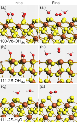 图 1. 黄铁矿{100}-V8和{111}-2S外表将OHads和水氧化成氧气的反响初始及终态构型。黄色、棕色、赤色和白色球别离代表S、Fe、O和H