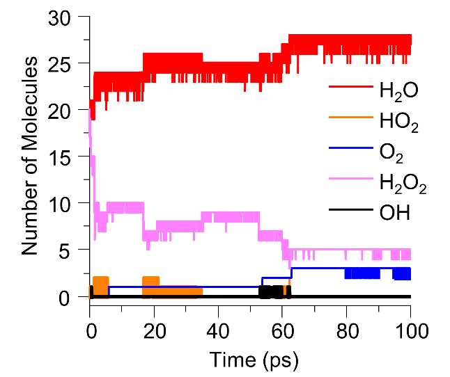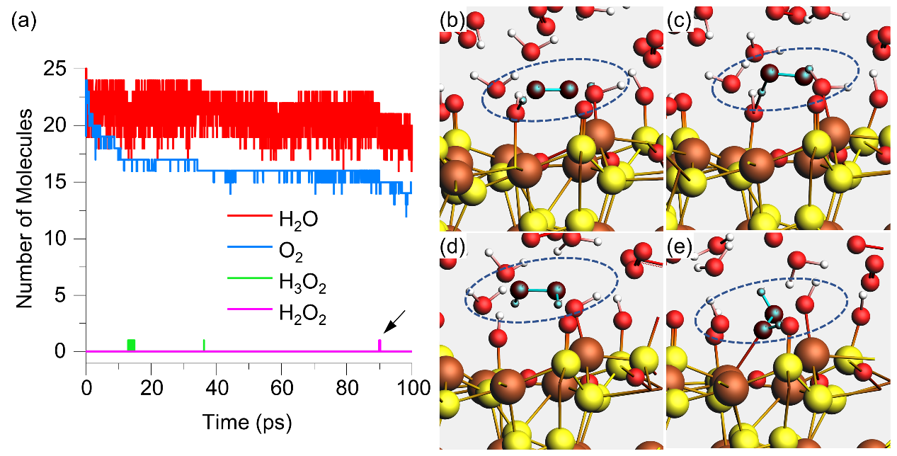 图 2. 黄铁矿{100}-V5外表被O2和H2O氧化100 ps期间的分子数改变(a);O2和H2O氧化黄铁矿{100}-V5晶面进程中构成H2O2的反响途径(b-e);蓝色高光的分子代表反响途径的示踪剂。黄色、棕色、赤色和白色球别离代表S、Fe、O和H